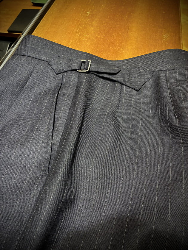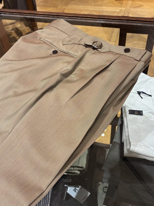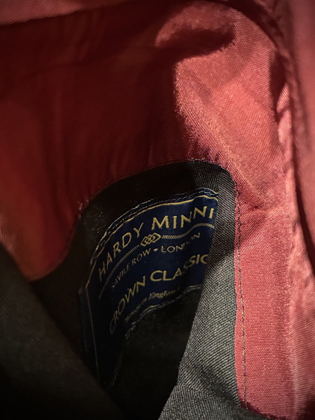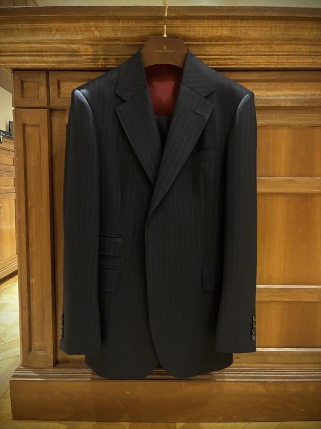 別注にてフラットなシルバーボタンに変更することで、ワークウェアの野暮ったさが消え、どこか都会的でラグジュアリーな一着に仕上がりました。