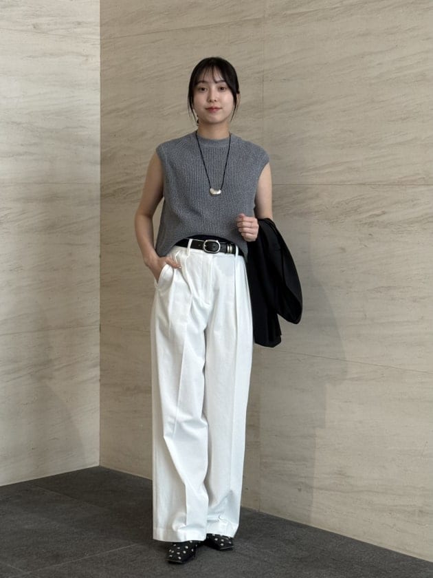 まずご紹介するのは毎シーズン大人気〈AK+1〉の新作アイテムです。ジレ、パンツともにAK+1を使用したスタイリングです♡