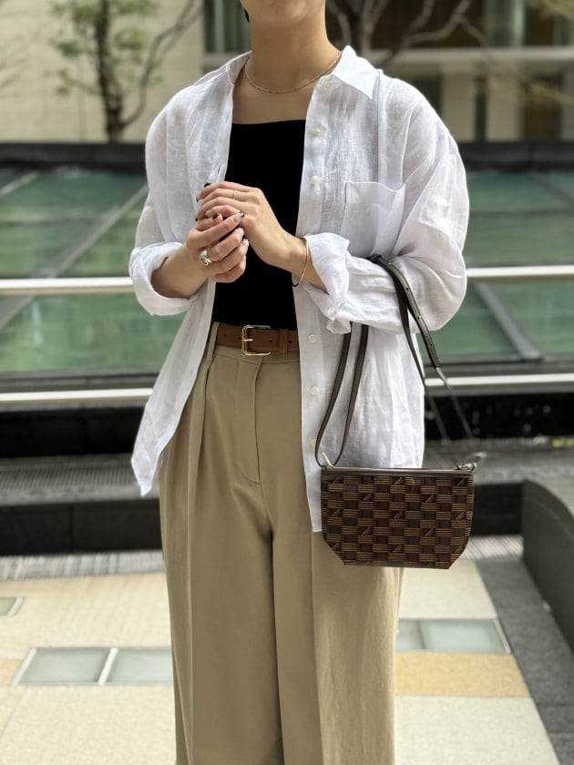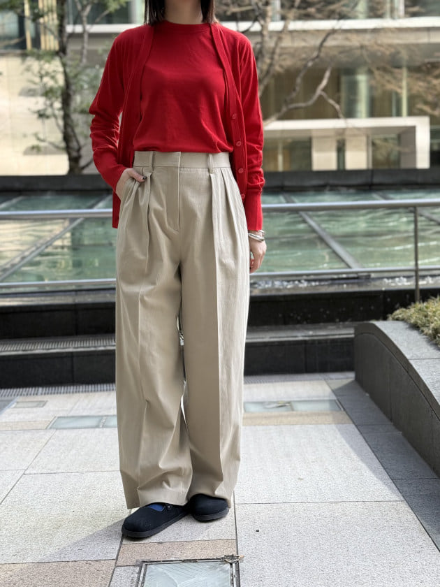 フロントのダブルタックのデザインが腰回りをスッキリ見せつつ、リネン特有の落感が大人の余裕を感じさせてくれる一枚です。