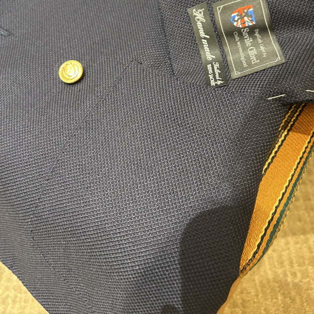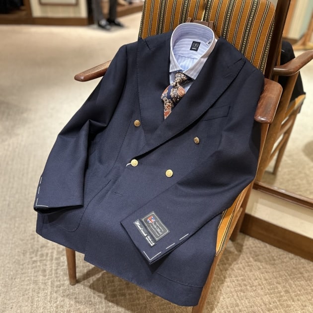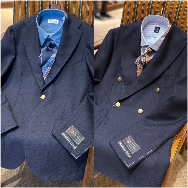 続いてこちらも【FERLA】社製高級生地。シルク38%リネン34%コットン16%ナイロン12%のラグジュアリーな雰囲気のダークブルーにシルバーのグレンプレイドオーバーペンジャケット。これも素敵ですね。