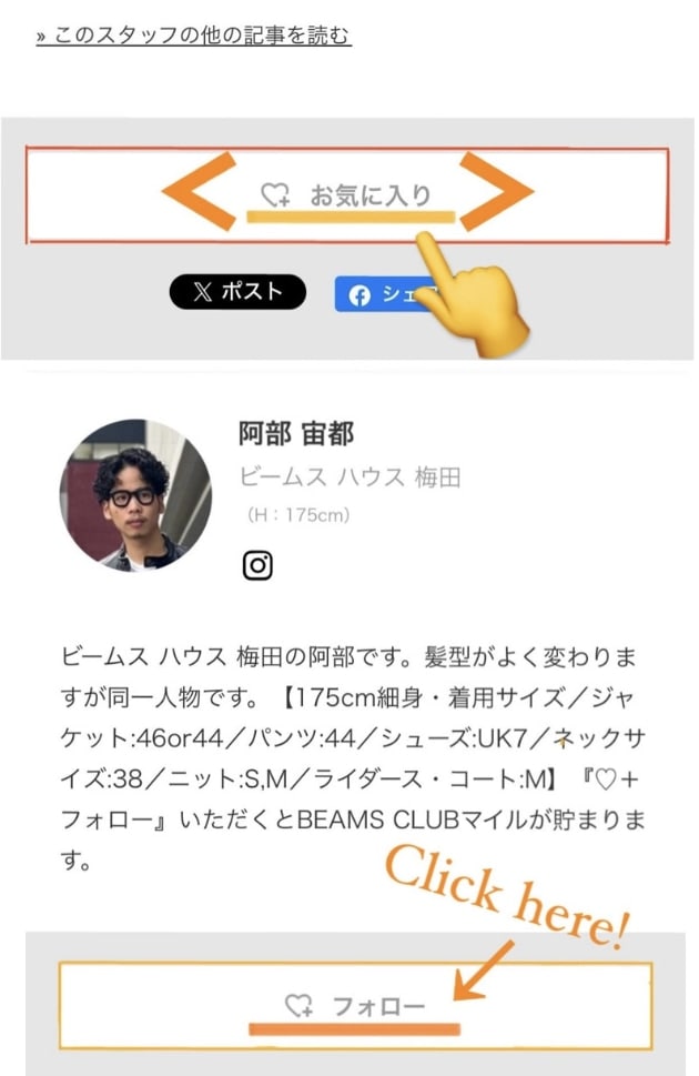 合わせてスタッフ名から【♡+フォロー】もしていただくとBEAMS CLUBマイルが貯まります。