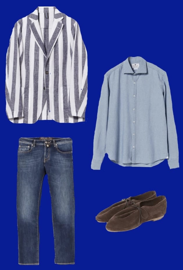 60年代フランスのファッションアイコンのアイコニックなコーディネートをジャケットの仕立ての軽さやストライプ幅、ジーンズの形、シューズのスウェード素材で今らしく刷新しました。シャツはボタンを開けて爽やかに着て頂くのがおすすめです。
