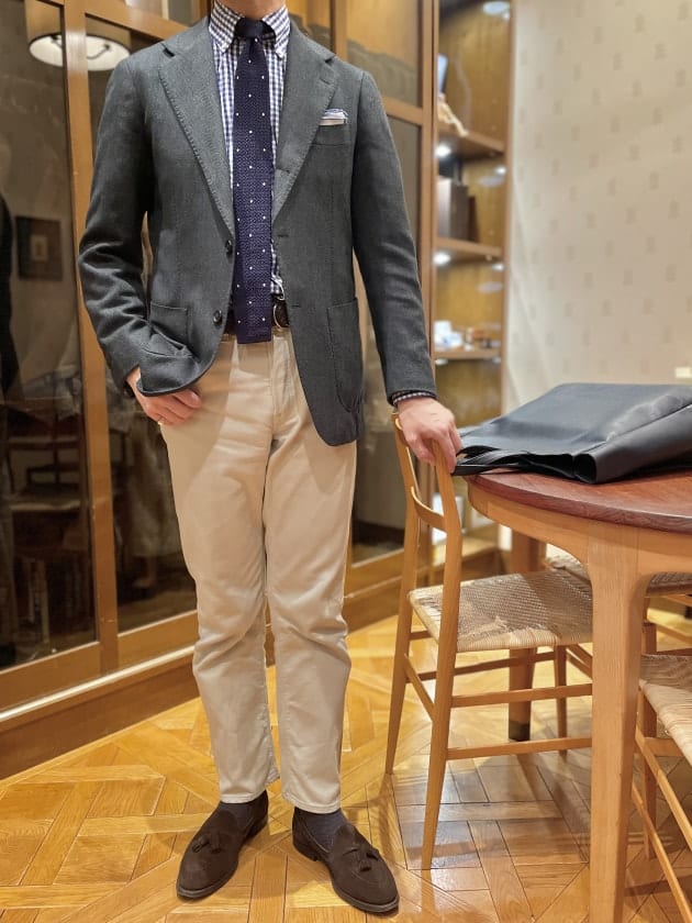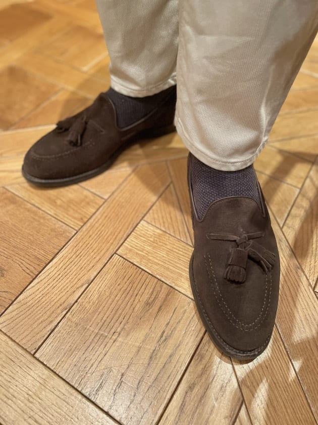 足元ももちろんスエードタッセルローファーで。