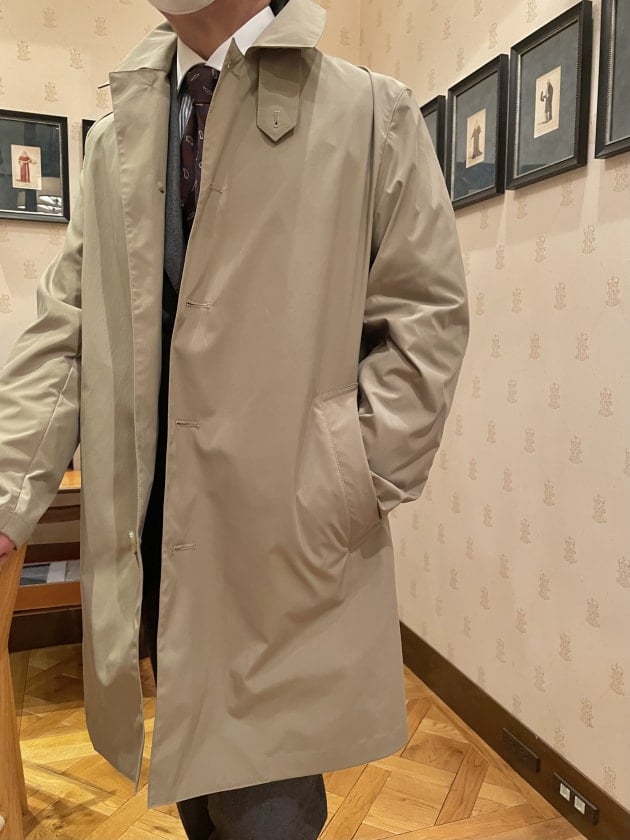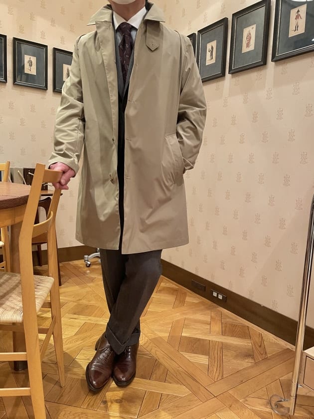 今シーズンの〈MACKINTOSH(マッキントッシュ)〉DUNKELDを羽織ってご来店。朝晩寒いこの時期に重宝するスプリングコート。