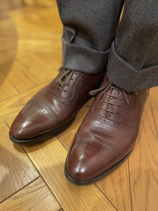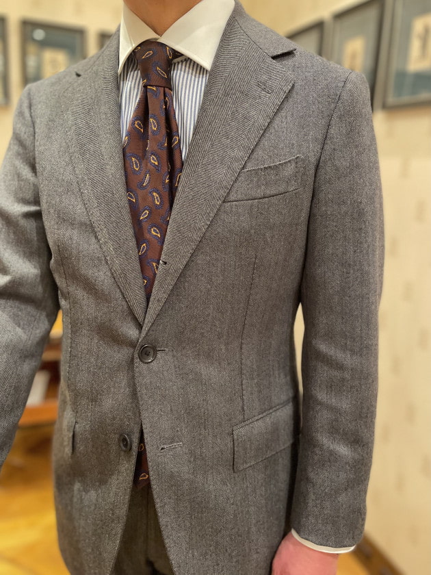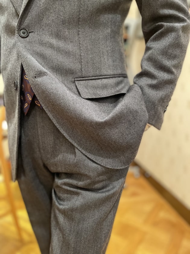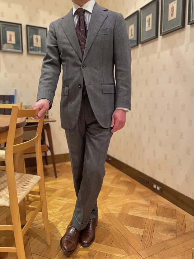H様の変わらない今のブリティッシュスーツスタイリング。コートを脱いでも抜かりはございません。