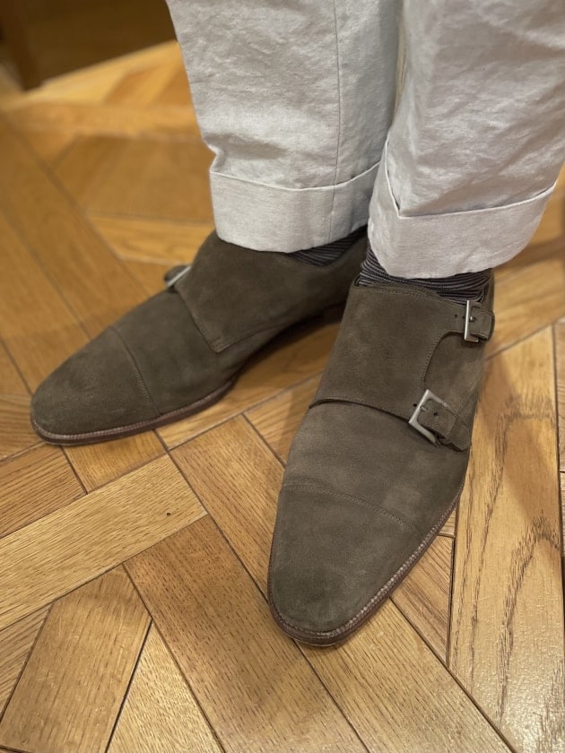そしてシューズは昔オーダーされた〈Enzo Bonafe(エンツォ ボナフェ)〉のスエードダブルモンクストラップ。ローデングリーンにもエイジングがすすみ、一層いい感じになっています。