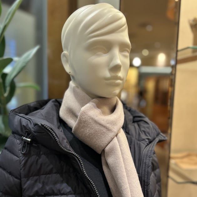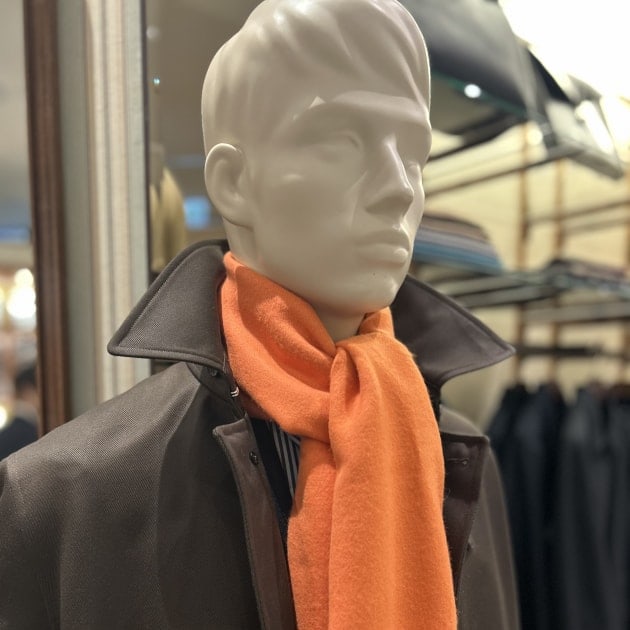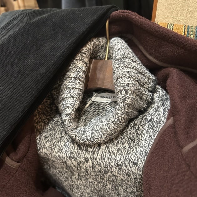この杢グレーの様な表情のあるタートルネックニットがコートの中には映えます。
