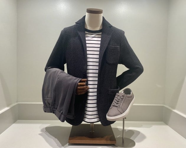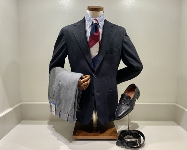 王道にネイビージャケットにグレースラックスの組み合わせ。