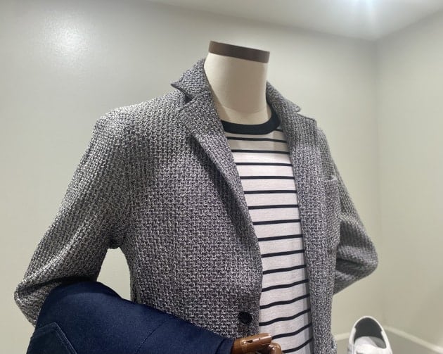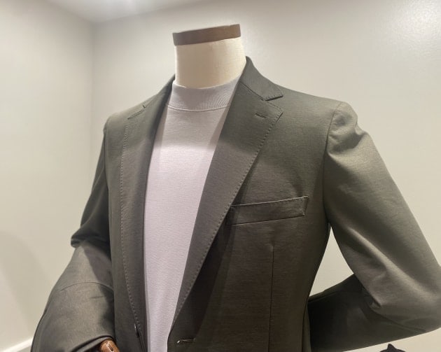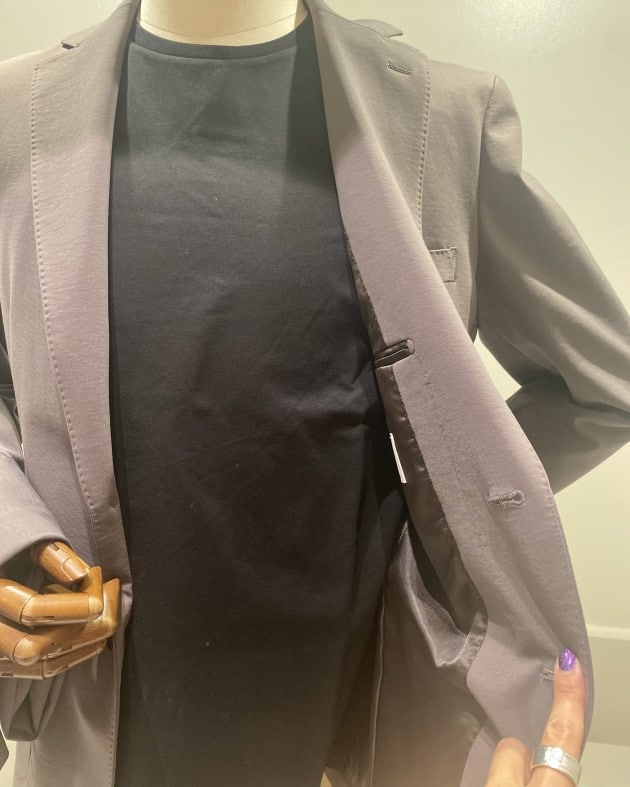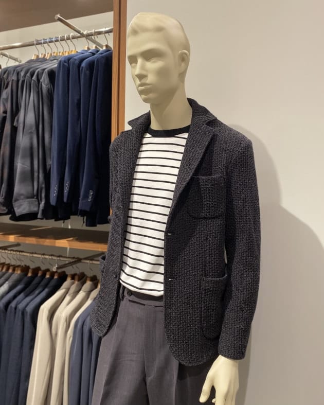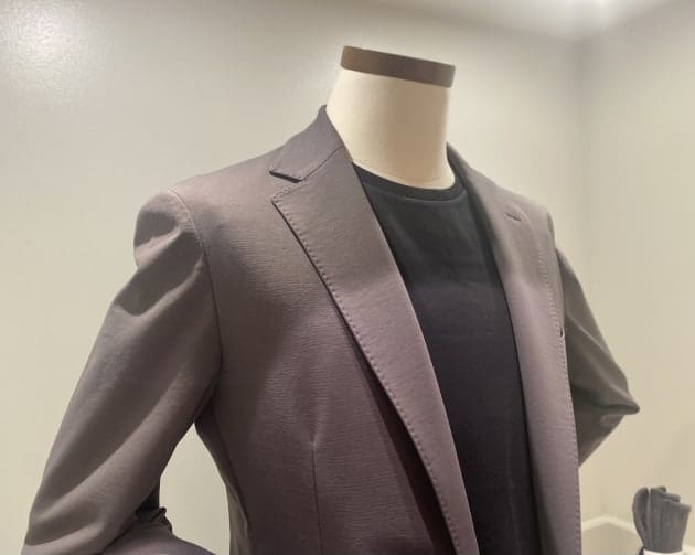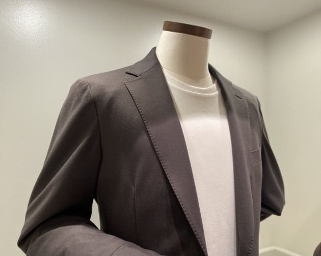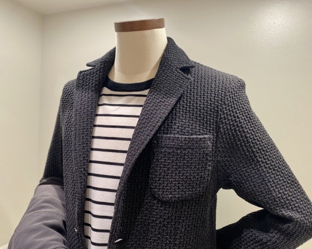 こちらは高いストレッチ性と防シワ性を実現する特殊な糸と編み地が特徴的で、ニット素材でありながら、布帛のようなハリ感と上品な光沢を併せ持つハニカム組織を採用したジャケットです。
