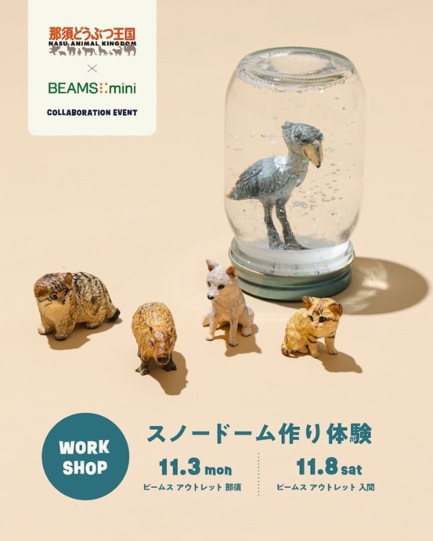 また、「ビームス アウトレット 那須」「ビームス アウトレット 入間」では、このコラボレーションの発売を記念して「那須どうぶつ王国」をテーマにしたとっておきの空間を店頭にて展開します。さらに限定でスノードーム作りワークショップを開催します。