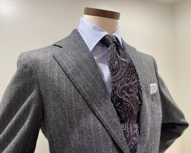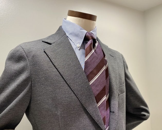 ネクタイと小物を変えるだけで、ビジネス寄りのスタイルに。