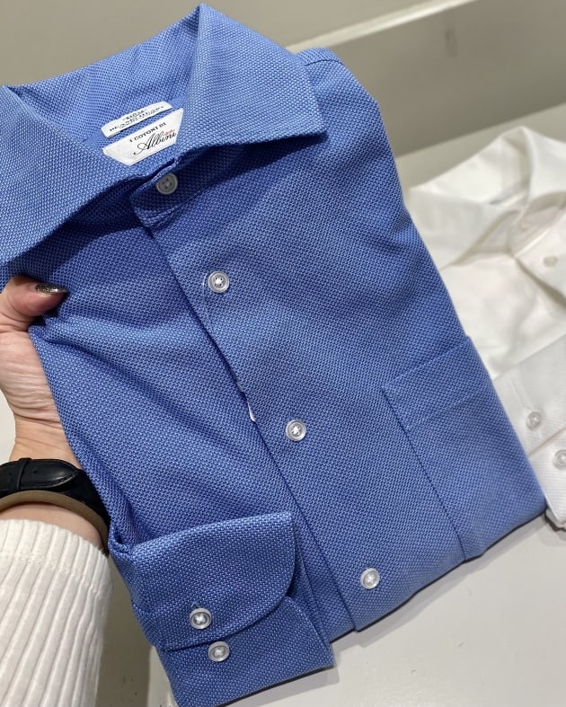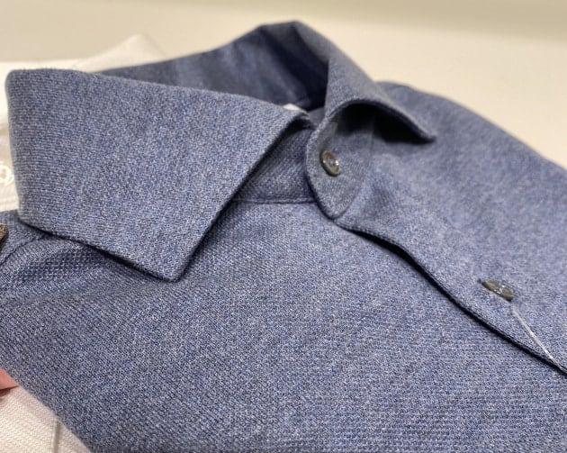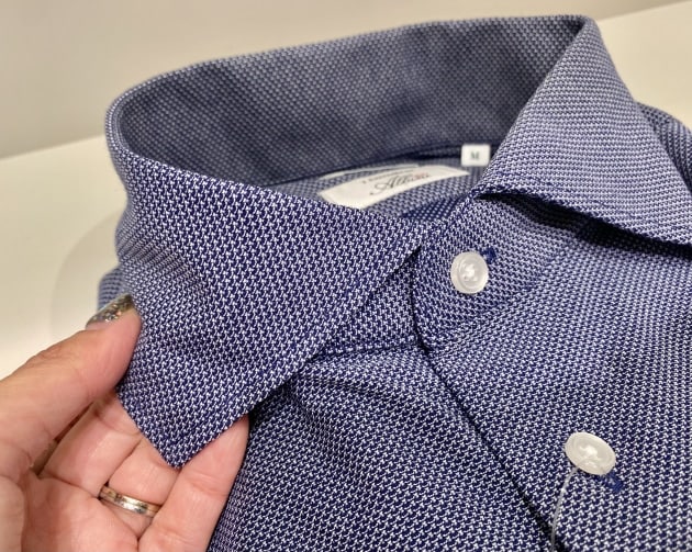イタリアの名門生地メーカー、〈アルビニ社〉のカラミ織り素材を使用したカッタウェイカラーシャツです。