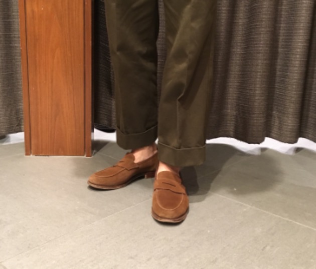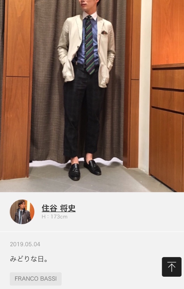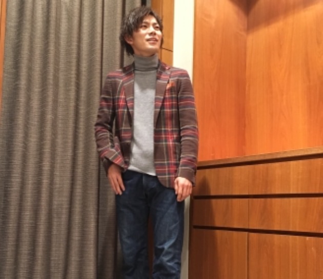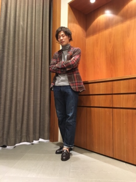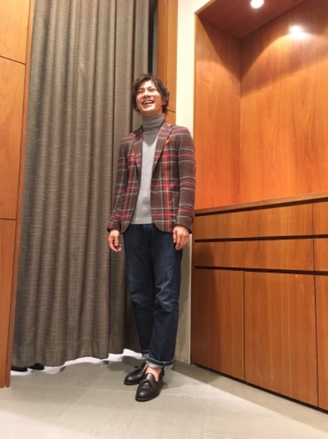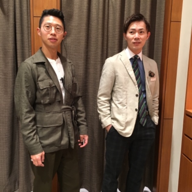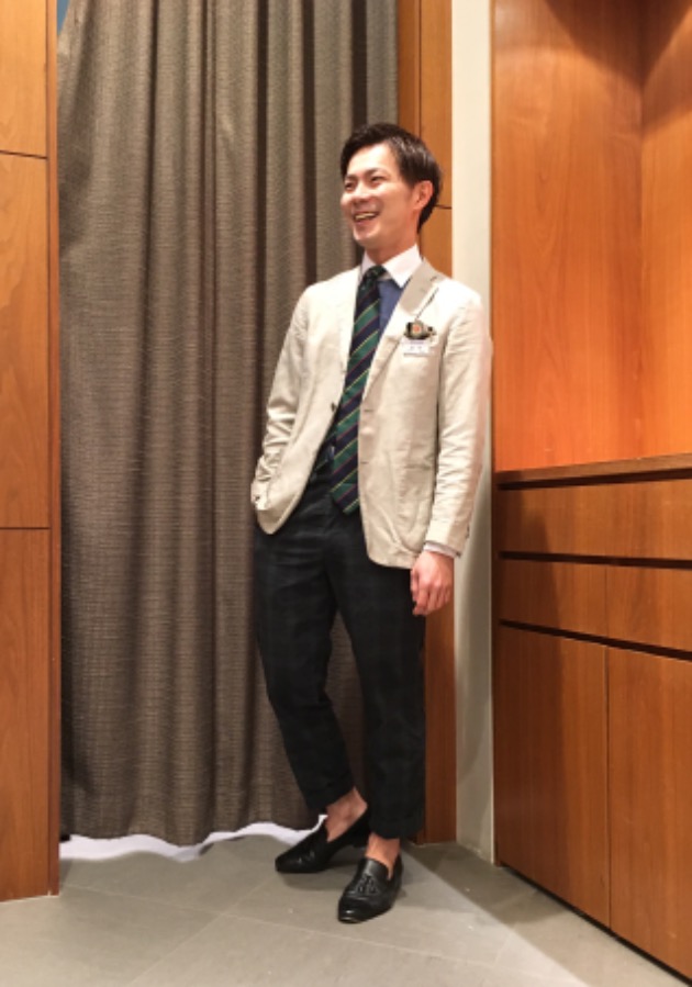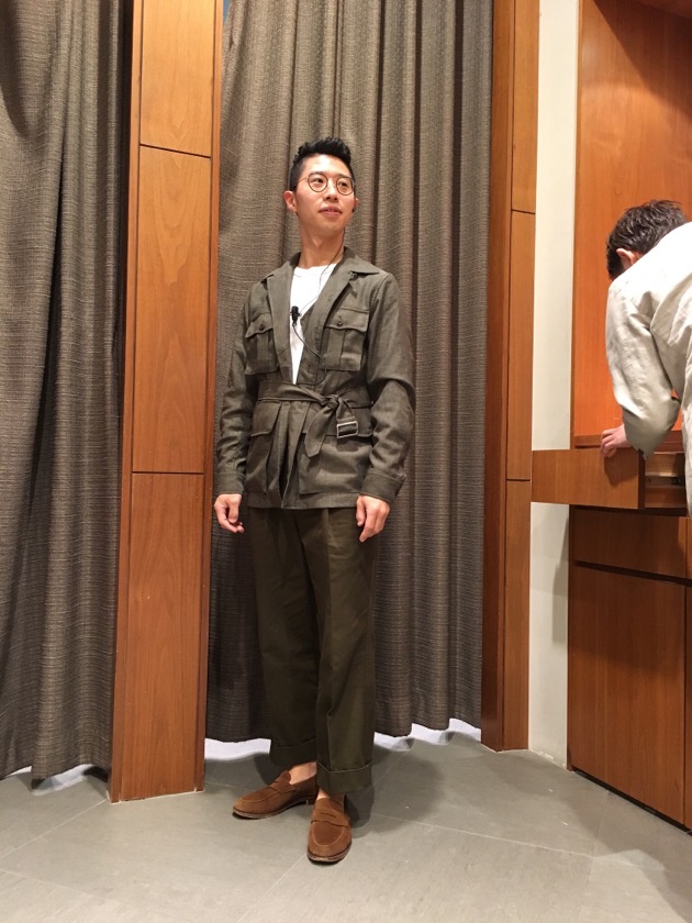 オスミはオープンカラーにネッカチーフを合わせてますが、無しで合わせるのもおススメです。(オスミ曰く、大人の色気があと5年早い気がして…とのことです。)