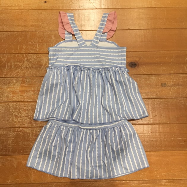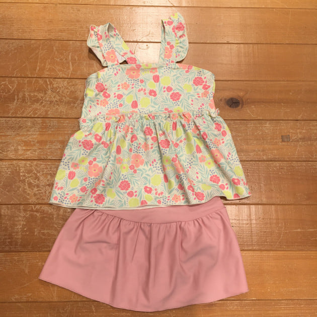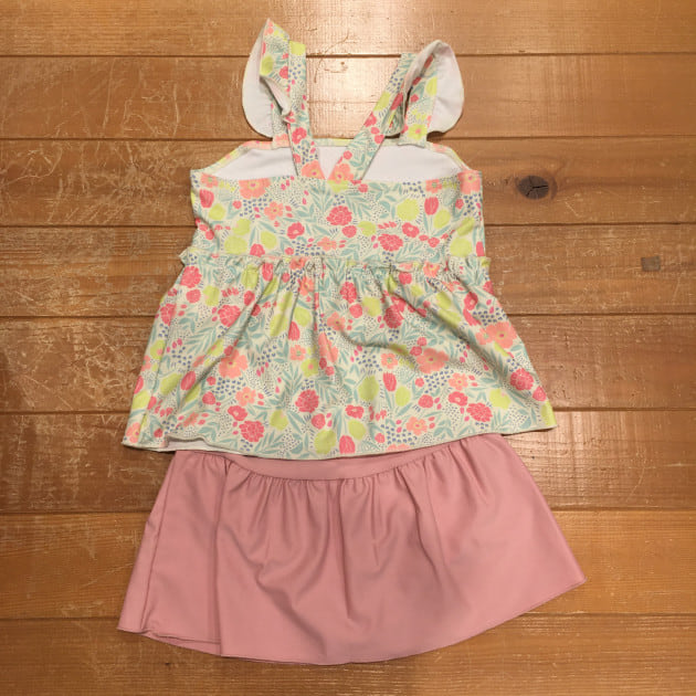 トップスの総丈は腰くらいまでの長さでパンツの上にフリルが重なるように仕上げています。