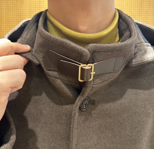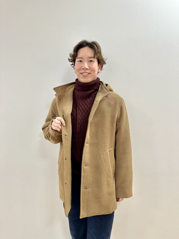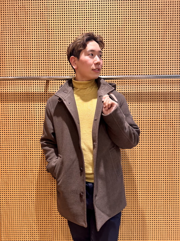 こちらは表地にポリエステルとコットンの棍棒素材を使用したステンカラーコートで内側には脱着可能なキルティングのライナーが付いているので長い期間着用可能でございます!