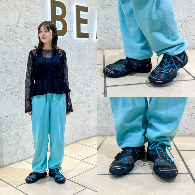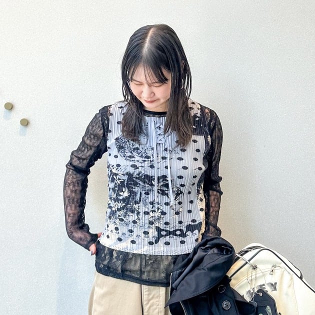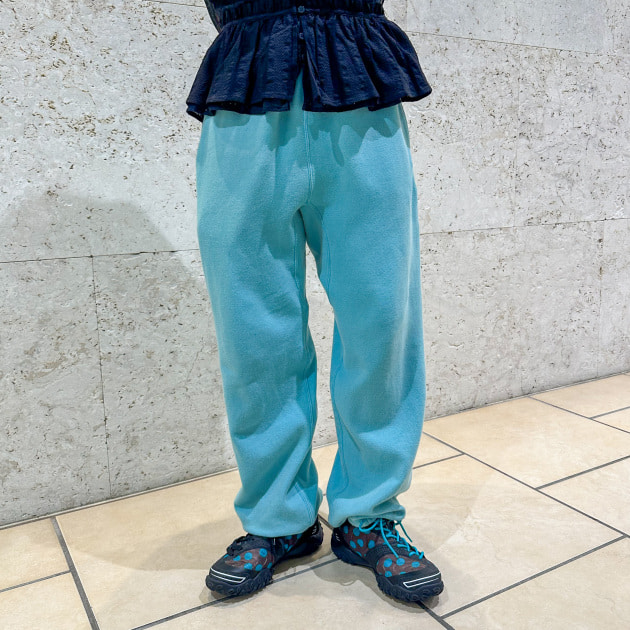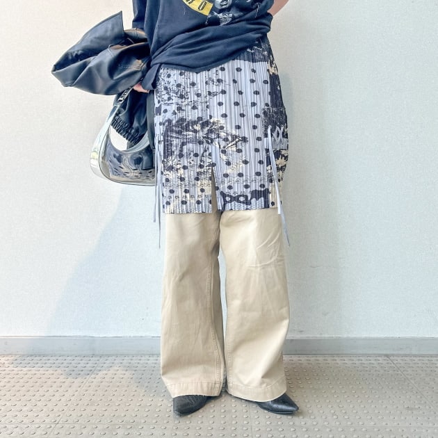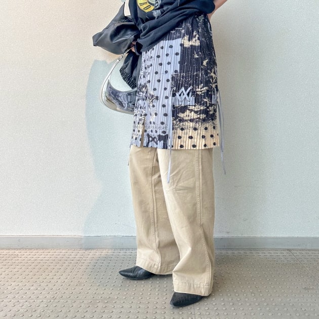 細かいプリーツなので、伸縮性があり、ワイドパンツと合わせても程よくシルエットに沿ってくれて、レイヤードの相性は抜群です。