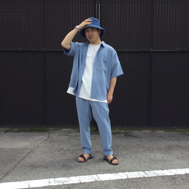 バケットハットとスポーツサンダルを使用して、ストリートに合わせています。