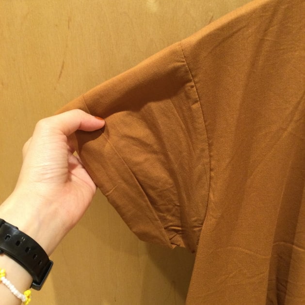 フレアでゆったりとした身頃に対して、このロールアップされた袖のおかげで二の腕の細見え効果があります。