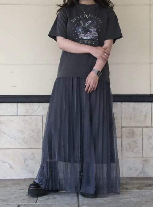 トップスが優しいカラーなのでスカートはバチっとブラックで★