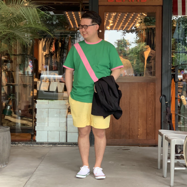 スポーティーな雰囲気でコーディネート。モノトーンのカラーリングでまとめて、イエローのキャップでチェックのラインの色を拾いました。