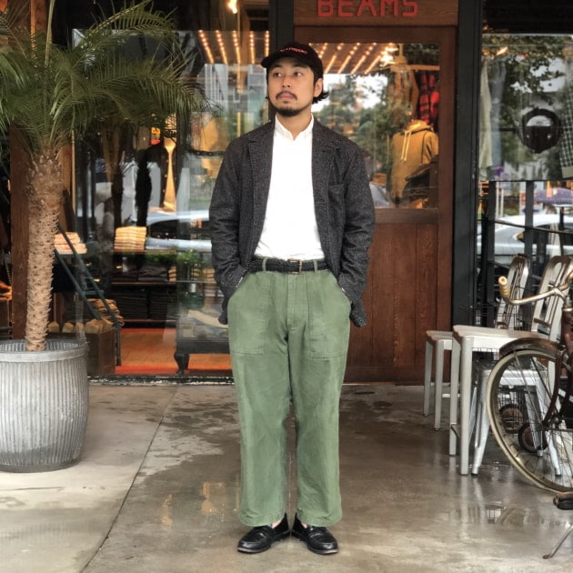 ワークテイストなチンストラップが付いていたり、比翼仕立てのジッパーフライで下部についた2つのフロントポケットは、A-2ジャケットを彷彿とさせるような武骨な仕様。
