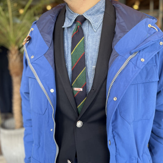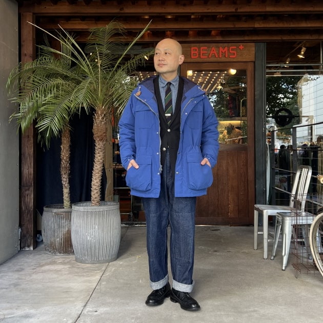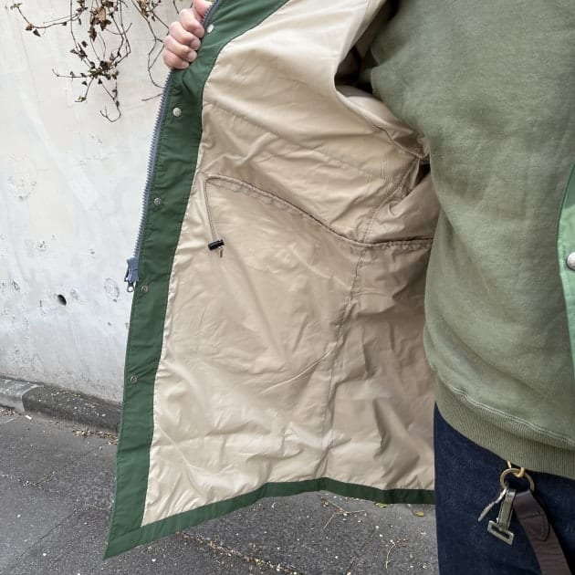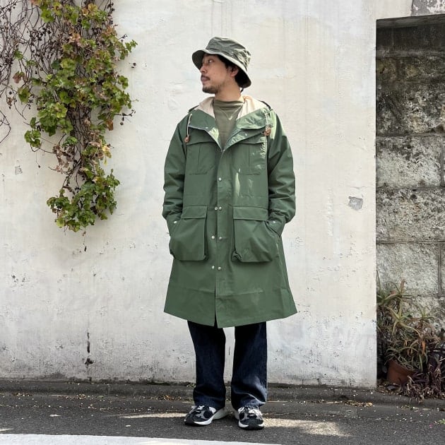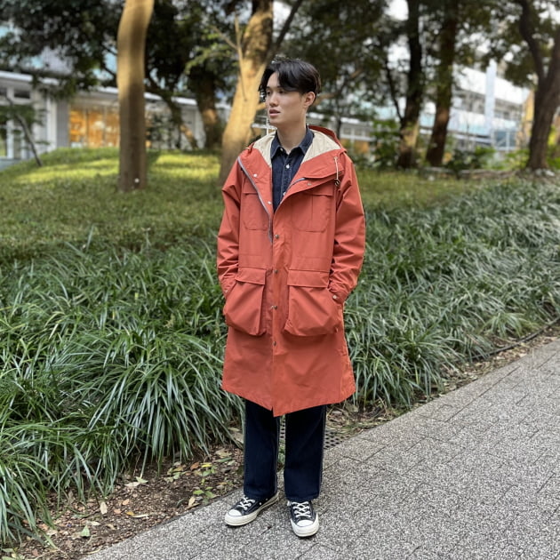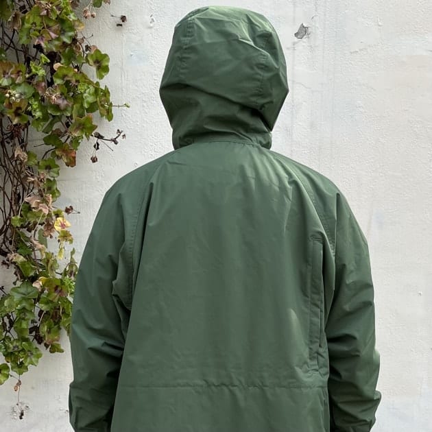 フードを外してインナーにスウェットフーディーを着用。モタつきも無いのでネック周りがスッキリ見えるのでシェルの様な使い方がおすすめです。また70年代に出ていたオリジナルに比べ身幅などはゆとりを持たせているのでインナーは様々なモノを選ぶ事が出来ます。