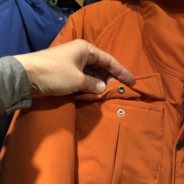 フロントのポケットは当時のディテールを感じれる、ジップポケットとマウンテンパーカーを彷彿とさせるフラップポケット。
