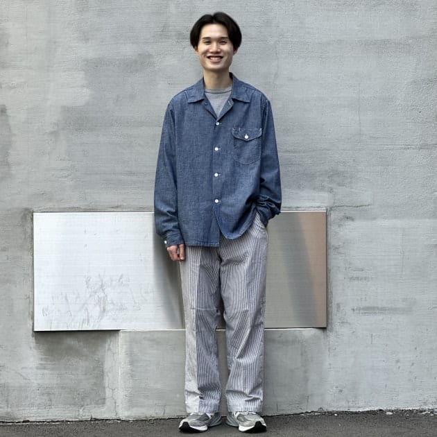 それだけでなく、デニムへの加工感の強さとシャツの柄も相まってアメカジムード全開です。