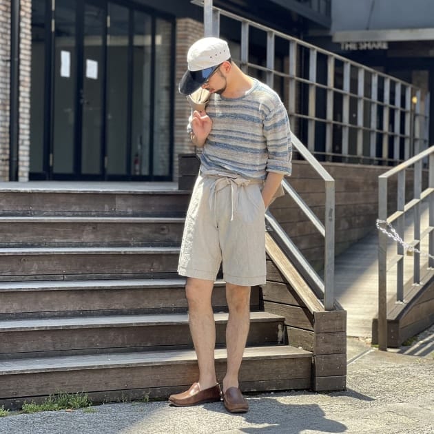 さて今回私はBEAMS PLUSのビーチシャツと組み合わせ、リゾートなムードを表現。全体をブルー系統で纏め爽やかな印象に。そこに映えるバーガンディのクロムエクセルレザーが上品な印象を与えてくれる。