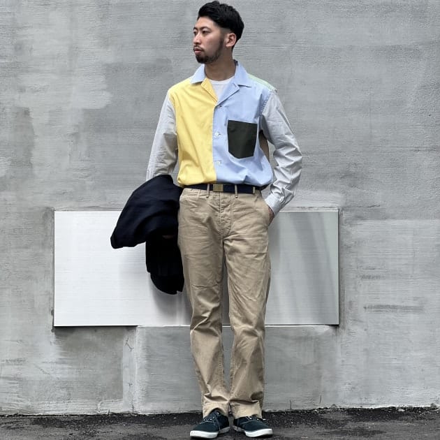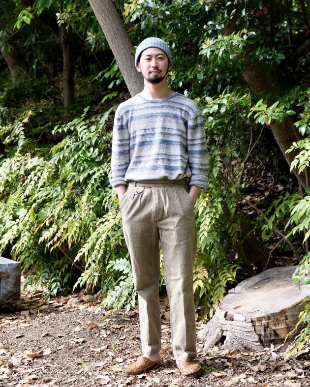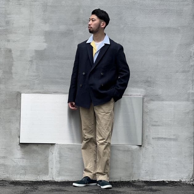 さて、スタイリングは浜辺の情景を連想出来るリネンニットと合わせ港町のフィッシャーマンをイメージ。