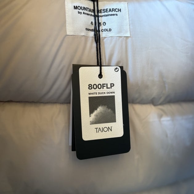 中綿には日本のダウンウェアブランドTAION社を使用。 ブランド名は潜在的な暖かさを意味し、日本発のイメージを膨らませる“体温”に由来します。また、ダウンの品質は表すFP(フィルパワー)は800FPと低山ハイキングやキャンプに携帯して持っていけるスペックだと思います。FPは高いほど軽量コンパクト性優れ、Lサイズで346gとなります。