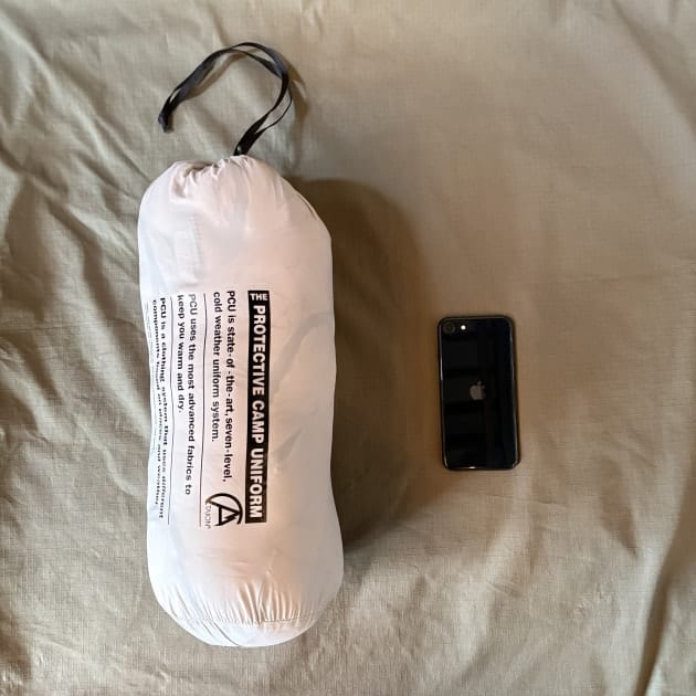 付属のスタッフバッグには収納しiPhoneSEと比較。もちろんバッグに入れてタウンユースで携帯するのも良し、スタッフバッグに入れた状態でキャンプの時に枕に使っても良さそうなサイズですね。