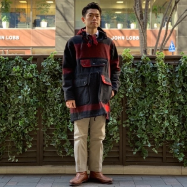 ステッチが施されたダブルニー仕様、裾に施されたジップなどタフなウェアを作るWOOLRICHらしいディテール使いはもちろんなのですが、スタッフ石川はブラックウォッチの配色を活かしてネイビーブレザーに合わせてトラウザーズ的な解釈でスタイリングしていました。