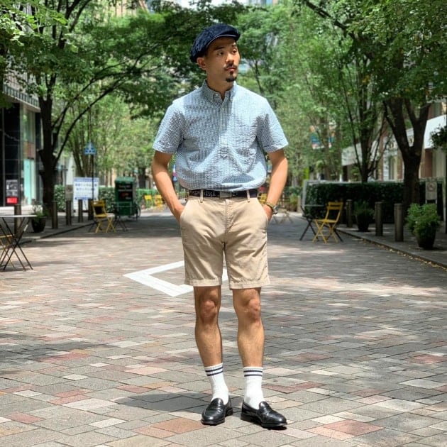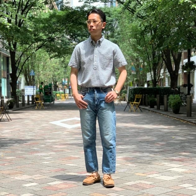 次はコットンパンツにカラーオックスフォードシャツ。一見派手と思われがちなシアサッカーは色物とも相性良し。