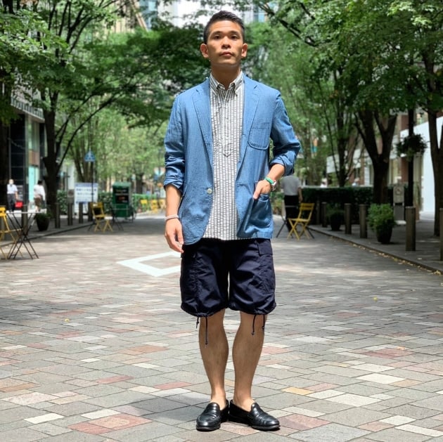 ブレザーにシャンブレーシャツ。シューズはダーティバックスでトラッドかつ軽快に。シアサッカーだからこそな清涼感があります。
