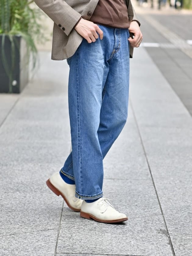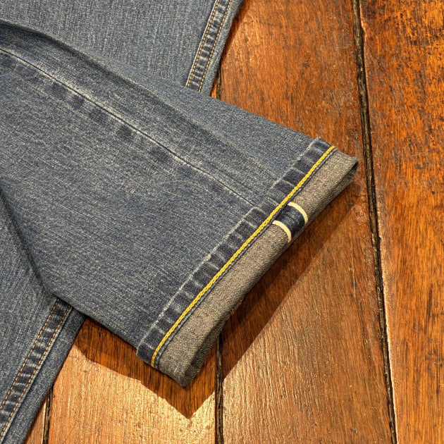 ワンウォッシュに比べると非常に軽いオンス。色落ちの見た目も相まって春夏のコーディネートにはピッタリです。
