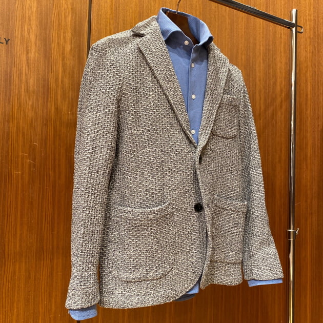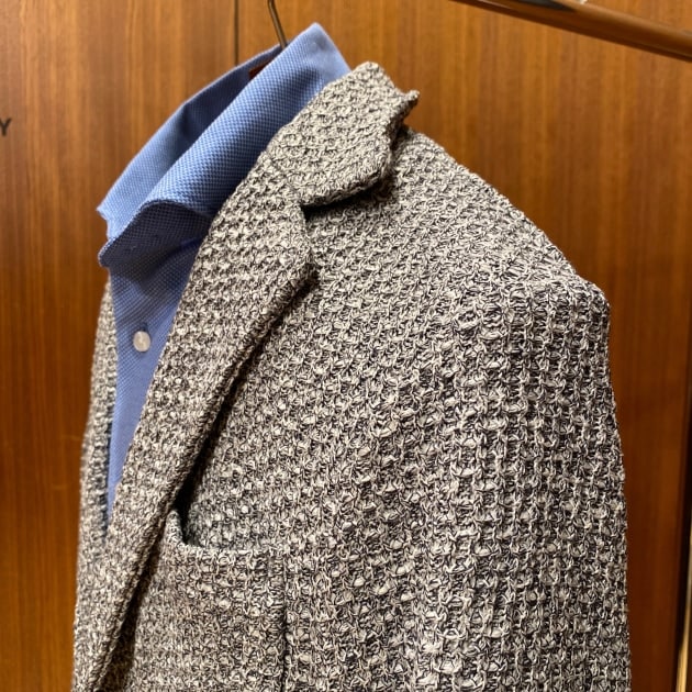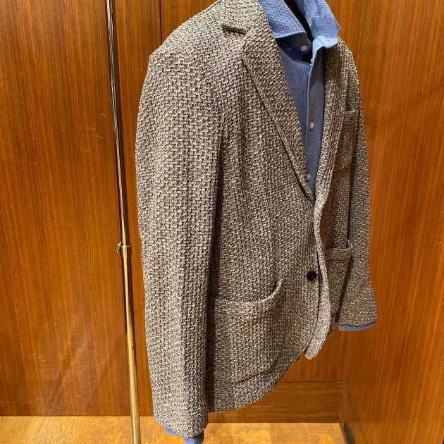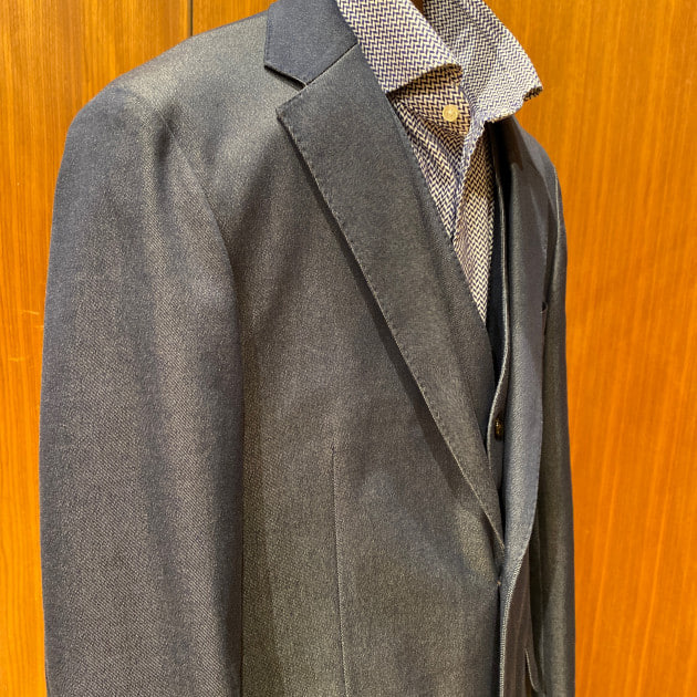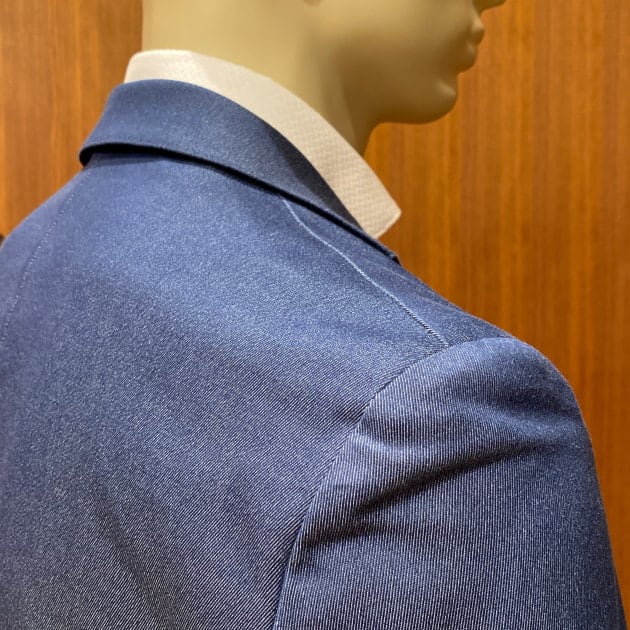アンコンストラックテッドな仕立てで、且つ立体的なショルダーラインです。