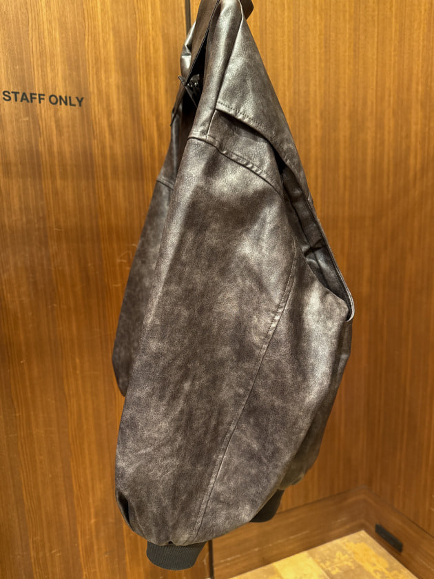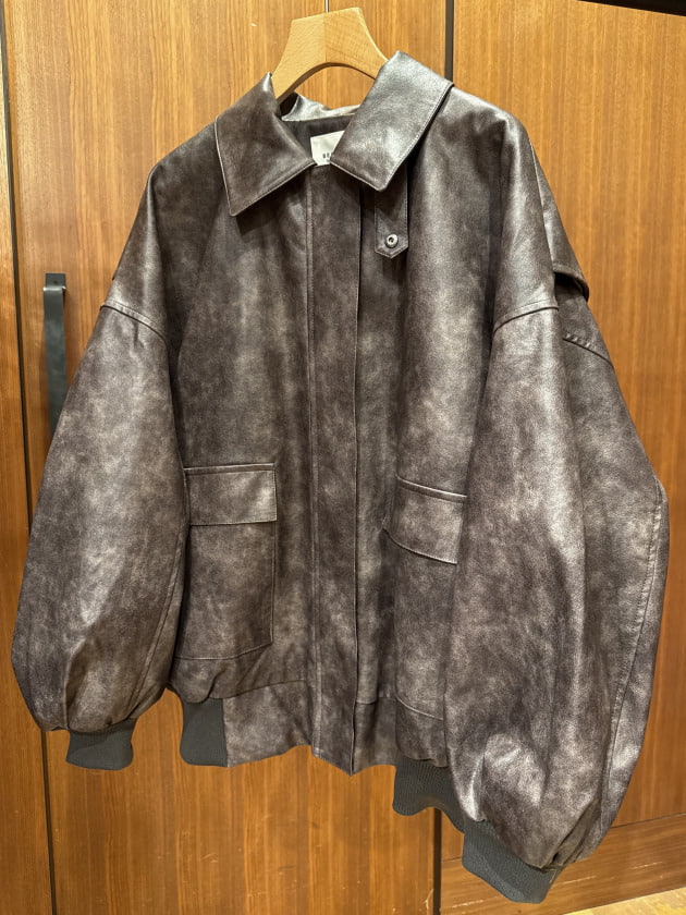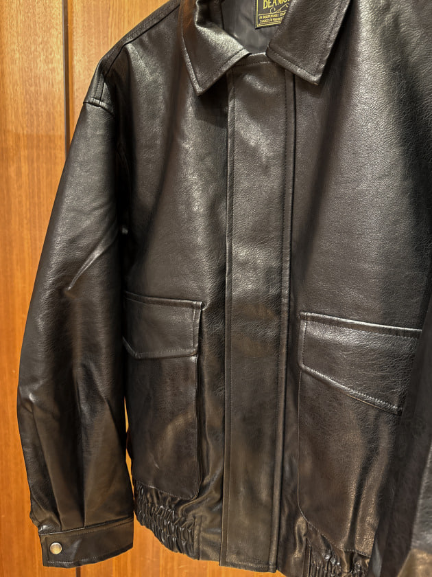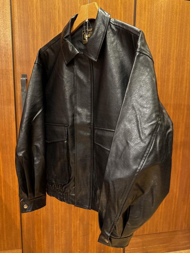 ブルゾンは、フライトジャケットのA-2をベースに、リアルなシボ感が再現されたフェイクレザーを使ったフライトブルゾンでございます。