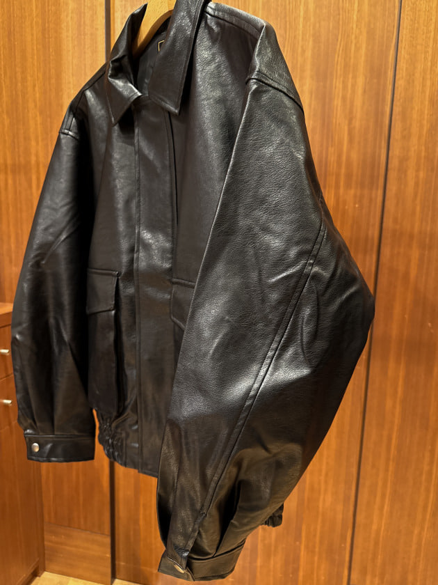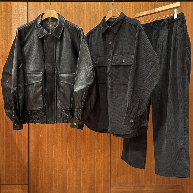 今回は、ブラックのクラシックフェイクレザーブルゾンに、ブラックのポリコールCPOビッグシャツ、ブラックのバルーンコーデュロイイージーパンツで合わせてみました。