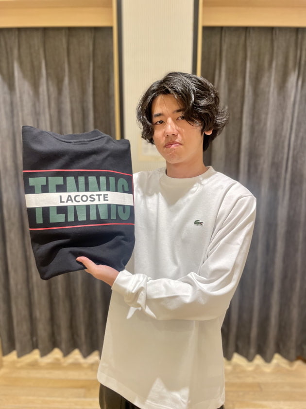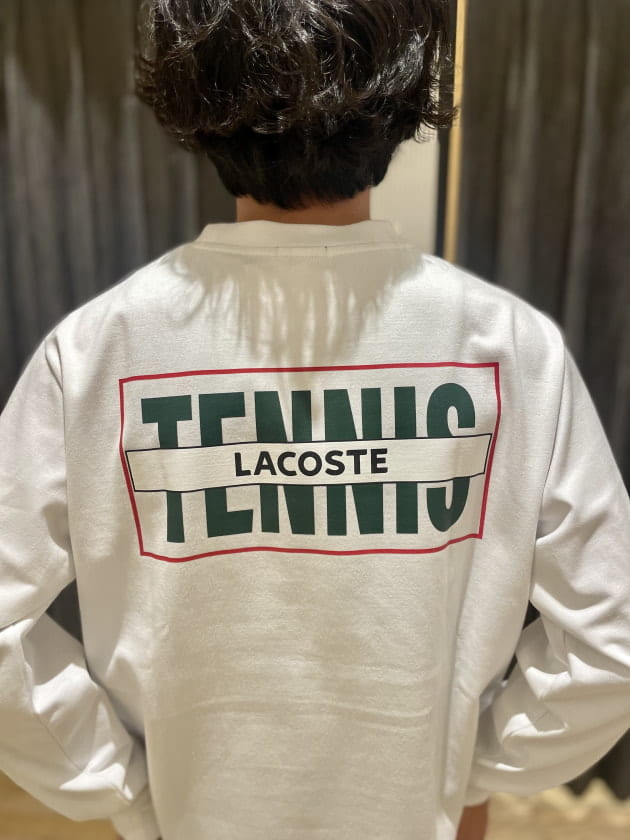 フロントは別注仕様のロゴを配置しつつバックプリントに大胆にも〈LACOSTE〉のアーカイブロゴを配置しています。