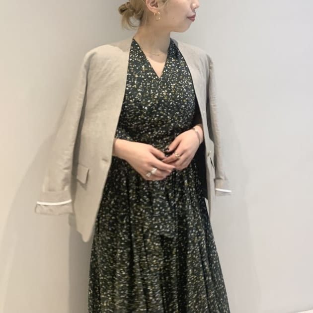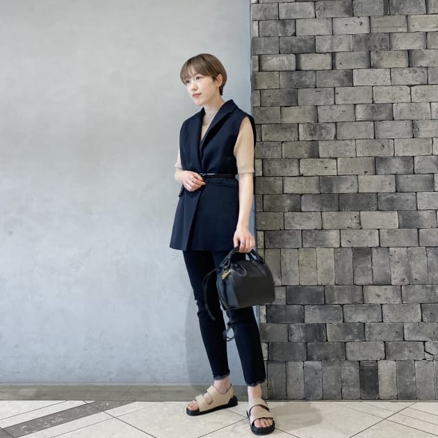 長めの着丈がポイントのなか、34サイズのチョイスですっきりシルエットに。