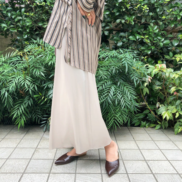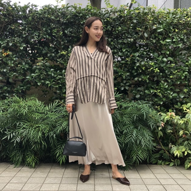 〈Rito〉のサテンドレスとのレイヤードスタイルで、161cmスタッフyu が着用致しました。