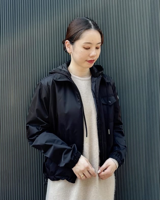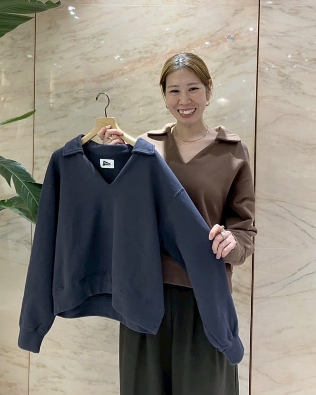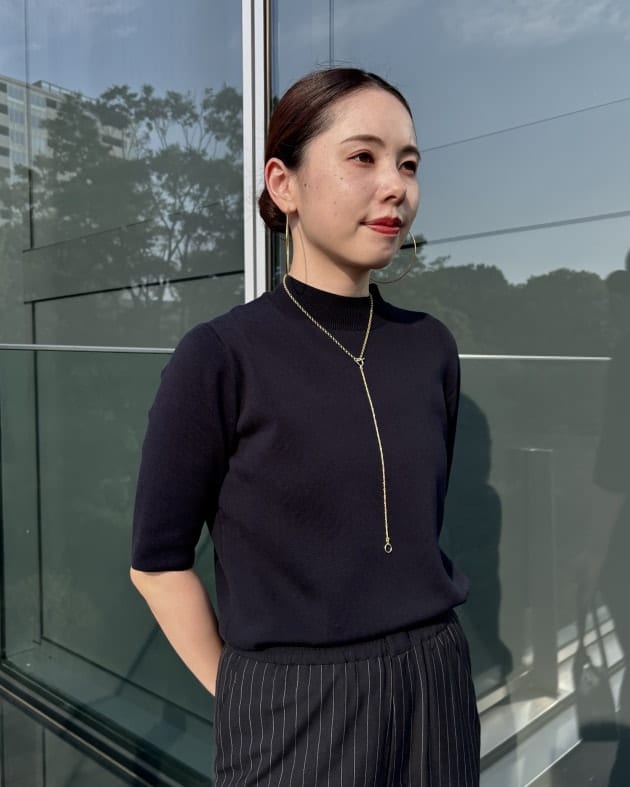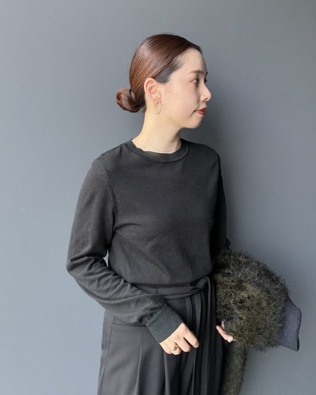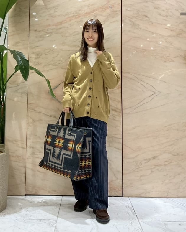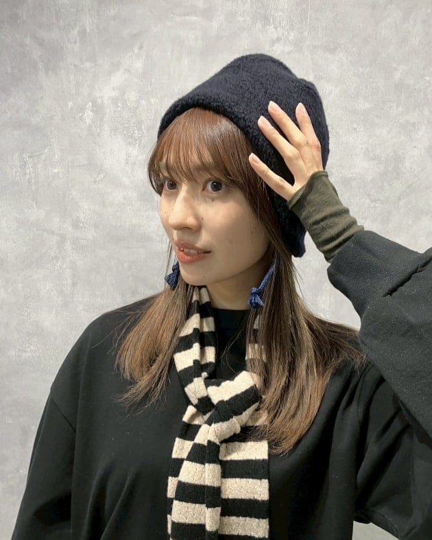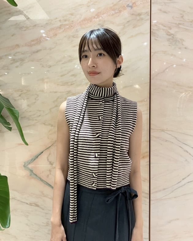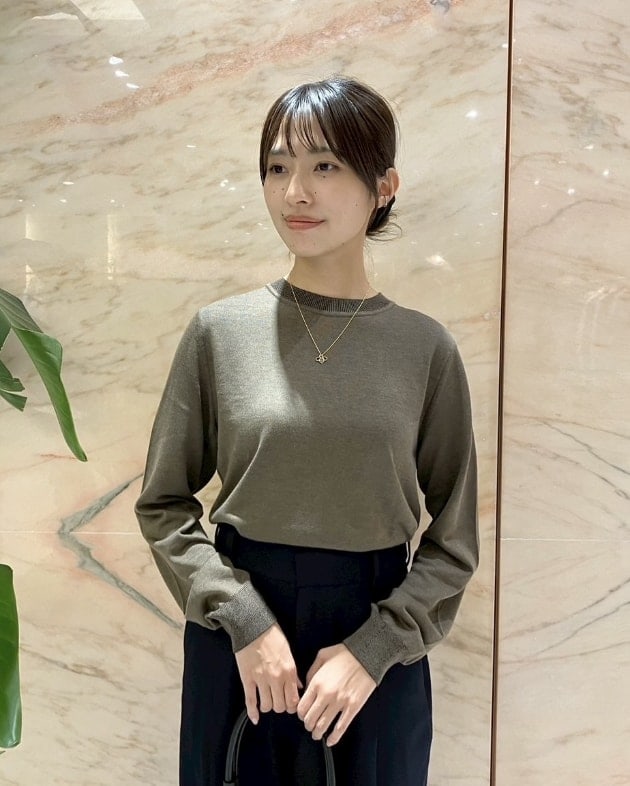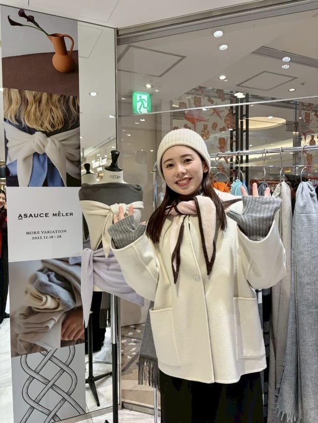 staff Ishihara が着用するのは、カシミヤのアームウォーマー。ニット帽や三角ストールなどと組み合わせて、冬らしいコーディネートをお楽しみいただけます。