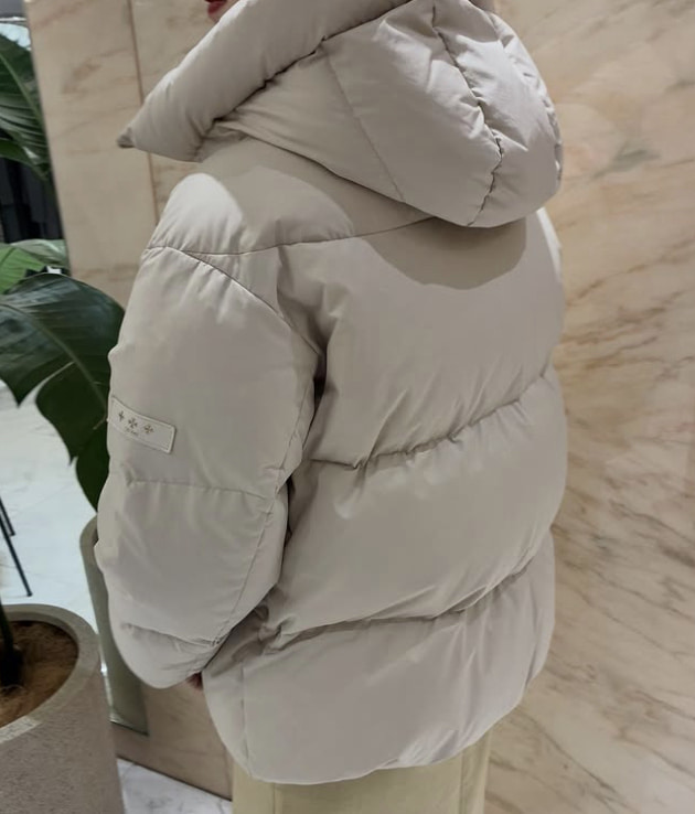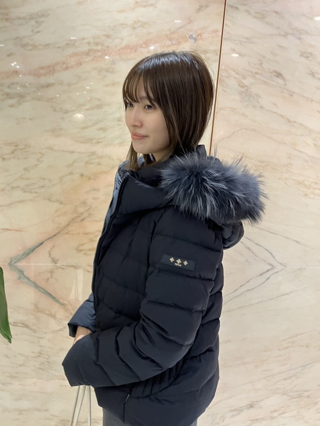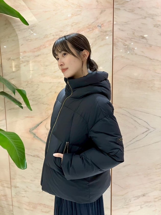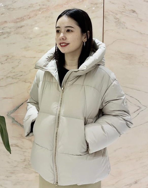 Aラインのダウンジャケットになっており、立体感のあるフードがあるのが特徴。首元までしっかり温めることができるので、冬でもぜひヘアをまとめたアップスタイルで合わせてみてください♡