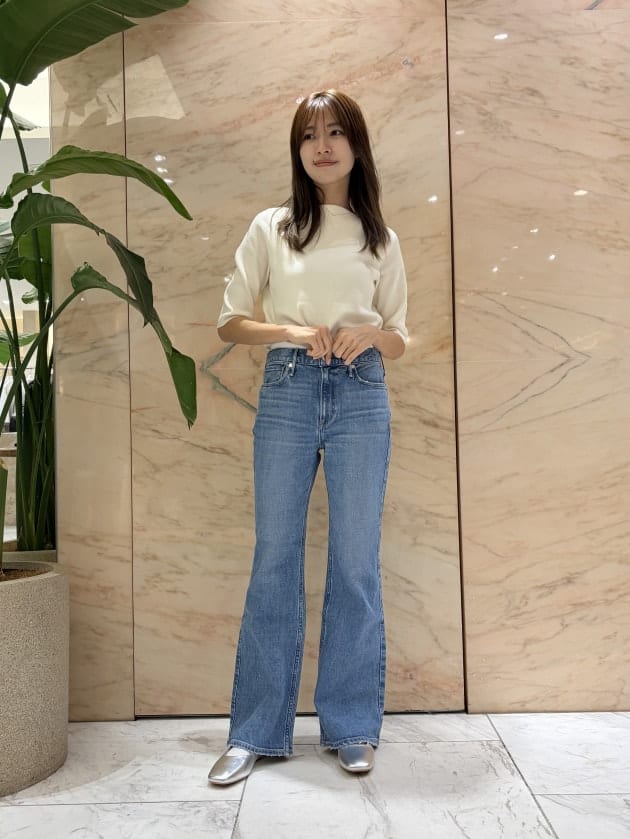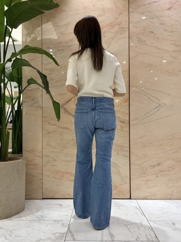 ミドルライズのフレアシルエットのアイテム。ウエストから太ももまではフィット感があり、細身でした。脚長効果抜群で、骨格ウェーブの方に特におすすめしたいアイテムです♡