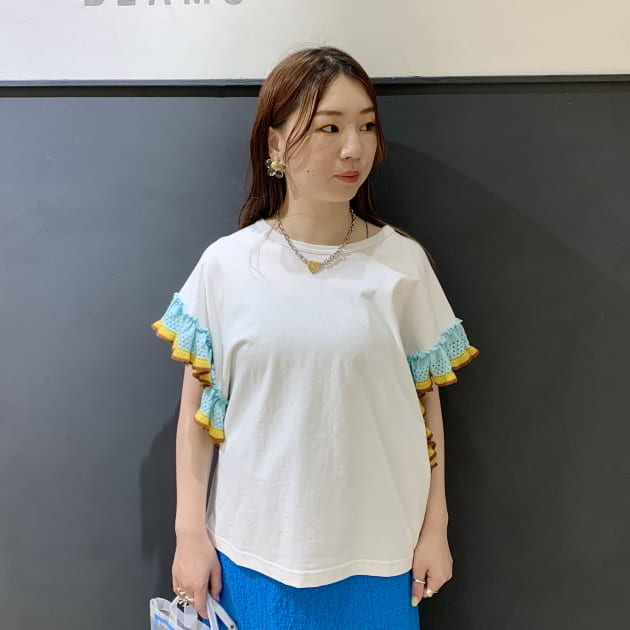 ウエスト位置が高く切り替えられており、二の腕はフワッとバルーンスリーブで細見えします。
