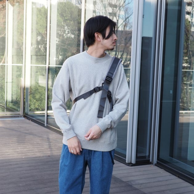 "SIMPLE YET"のクルーネックスウェットに同色のショルダーバッグを使ってポイントに。