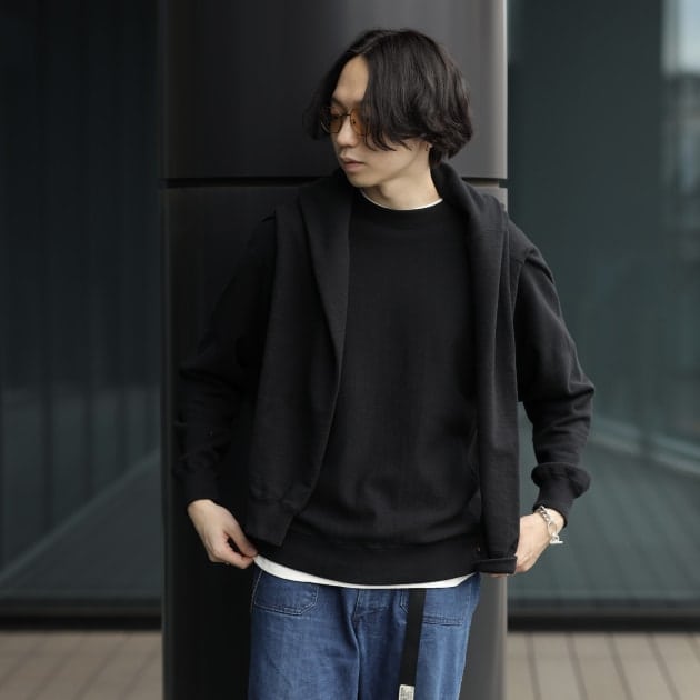 共地のクルーネックとフーディーを合わせたアンサンブルスタイル!
