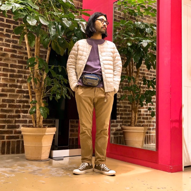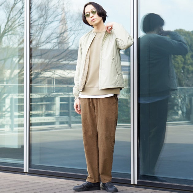 インナーにベージュを使ってるのでパンツはブラウンのテーパードイージーパンツを合わせてグラデーションになるよう意識しました。