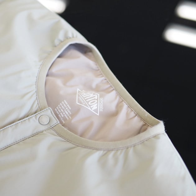 襟ぐりには伸縮性のあるパイピングを配してストレスなく着用が可能。